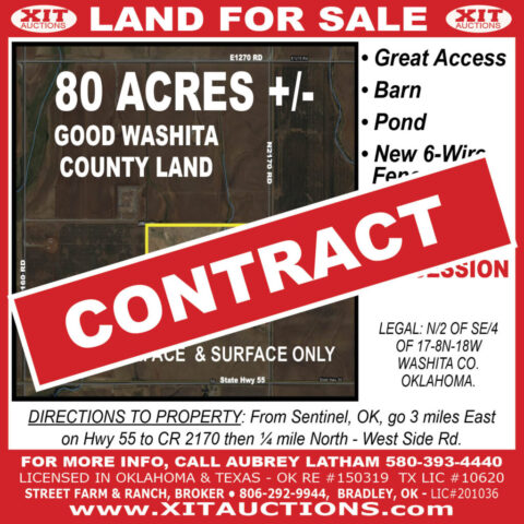 DIRECTIONS: Canute, OK – (4 way stop) 9th St. & Rt. 66, Go 1 mile west on Route 66. Watch For Signs.